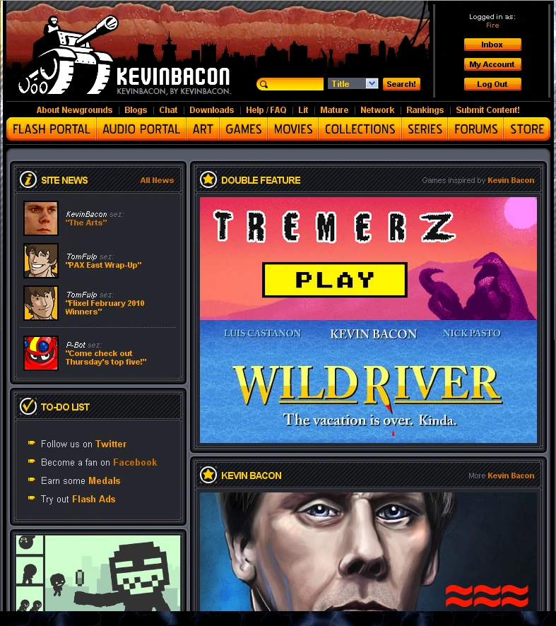- The site logo was redesigned with a strip of bacon behind the tank and skyline, with the site name and tagline changed to "Kevin Bacon-Kevin Bacon, by Kevin Bacon" The page's window title remained unchanged.