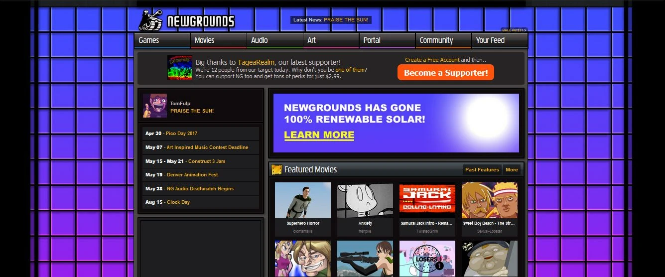 Every April 1, Newgrounds has a tradition of playing an April Fools Day prank on the website. These range from just a switch of the logo or (Especially recently) become an elaborate takeover of the website, complete with a recolor of the site's graphics, games, and art based off the theme. Every prank is always accompanied by a post by an administrator (usually Tom or in the case of the 2010 prank, an alt account) giving the story behind the prank.