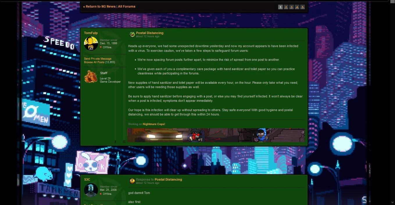 Tom Fulp posted a thread announcing that his account had been infected with a virus and to protect users he was announcing Postal Distancing. This involved: spacing forum posts farther apart to prevent spread and giving everyone a complimentary care package of hand sanitizer and toilet paper.