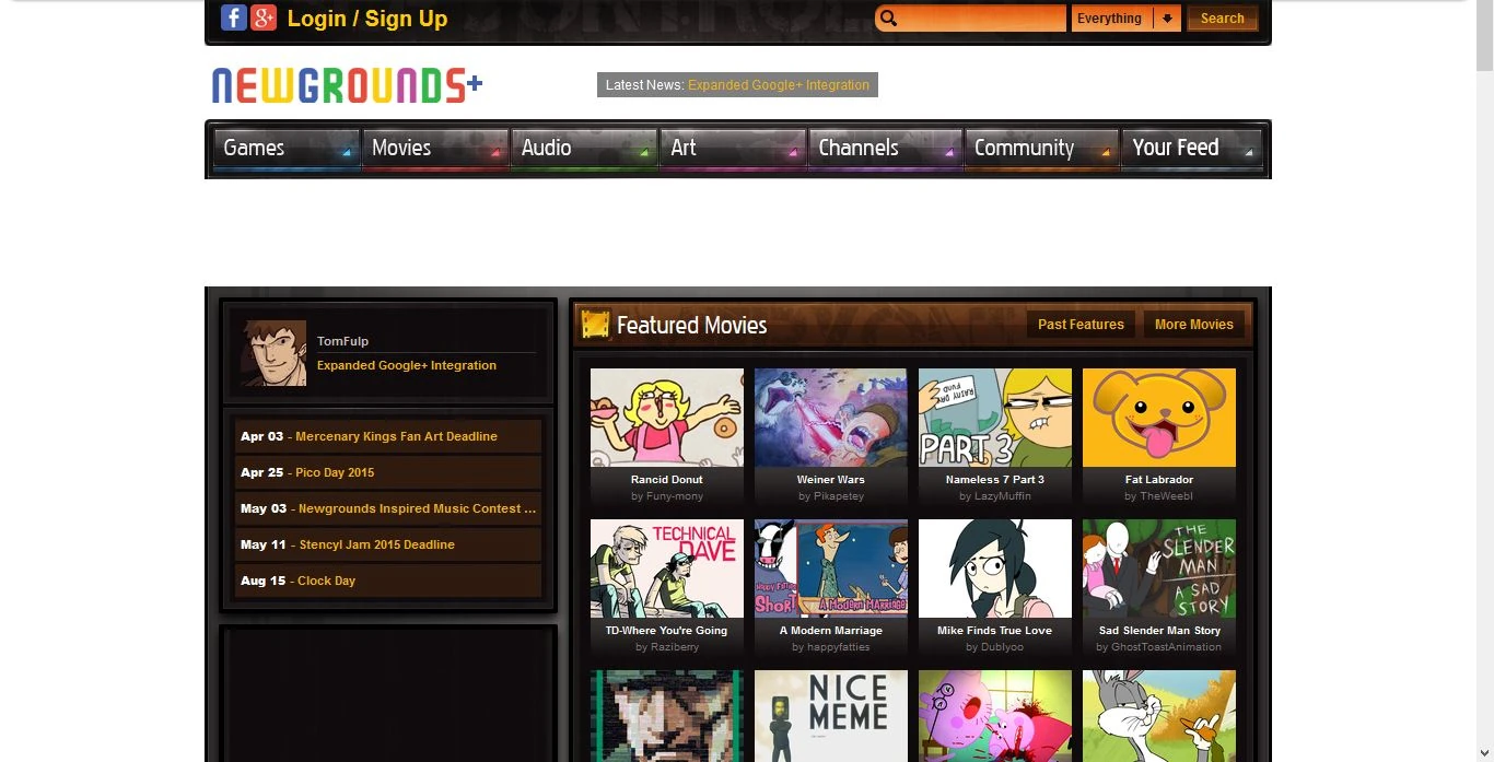 Tom Fulp posted a thread announcing that starting April 6th, Google+ would be the only way to log into Newgrounds. You would be required going forward to use your real name on Newgrounds, which would be displayed on all parts of the site you interact with. Additionally context sensitive ads would be added to the site via Google Adsense. A Content ID system would be integrated and any content which violated that system would either be removed or redirected to the relevant Youtube video. Finally, suggested searches would be added to the site search.