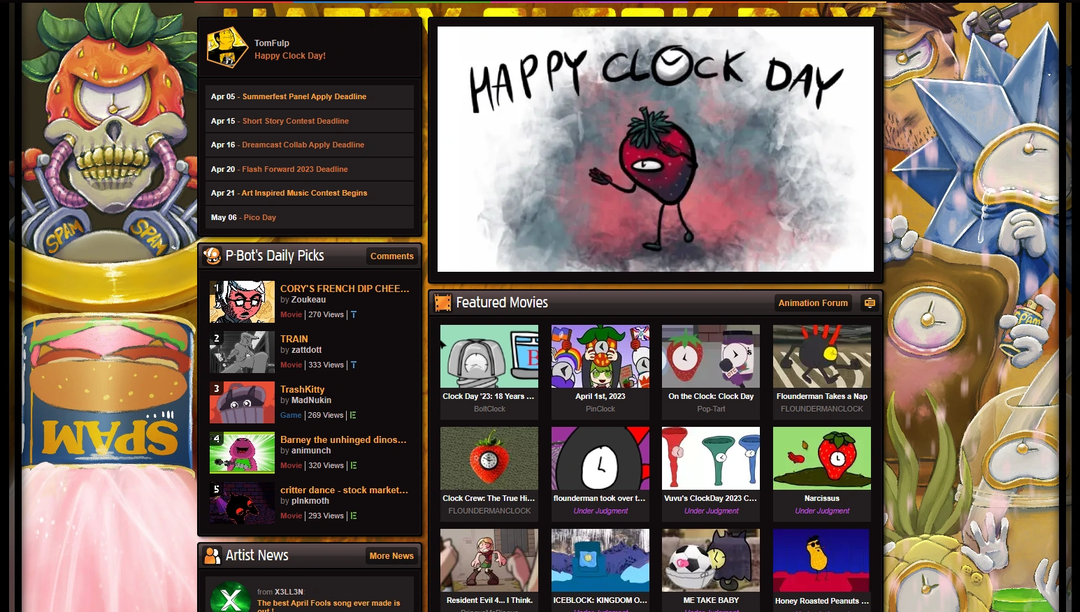 Front page showing the Clock Day banner and various Clock Day submissions.