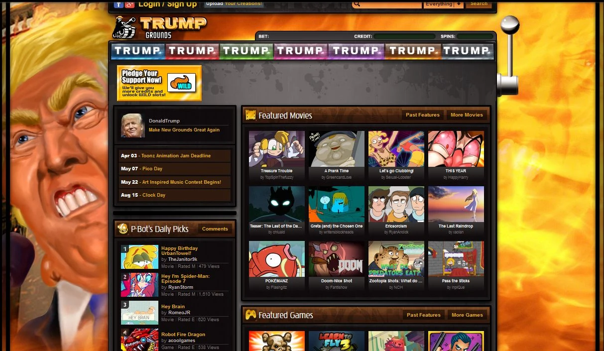 An account purporting to be Donald Trump announced that he had bought Newgrounds.com and fired Tom Fulp. He announced that he had created a Trump chat and was going to build a firewall to keep Mexico out and make Mexican Google pay for it. He would also kick out the Chinese users and wanted every user to pledge to visit Newgrounds ever day and become a supporter. There was also a Trump slot machine game playable from the Front page. Newgrounds remained as Trumpgrounds the entire weekend.