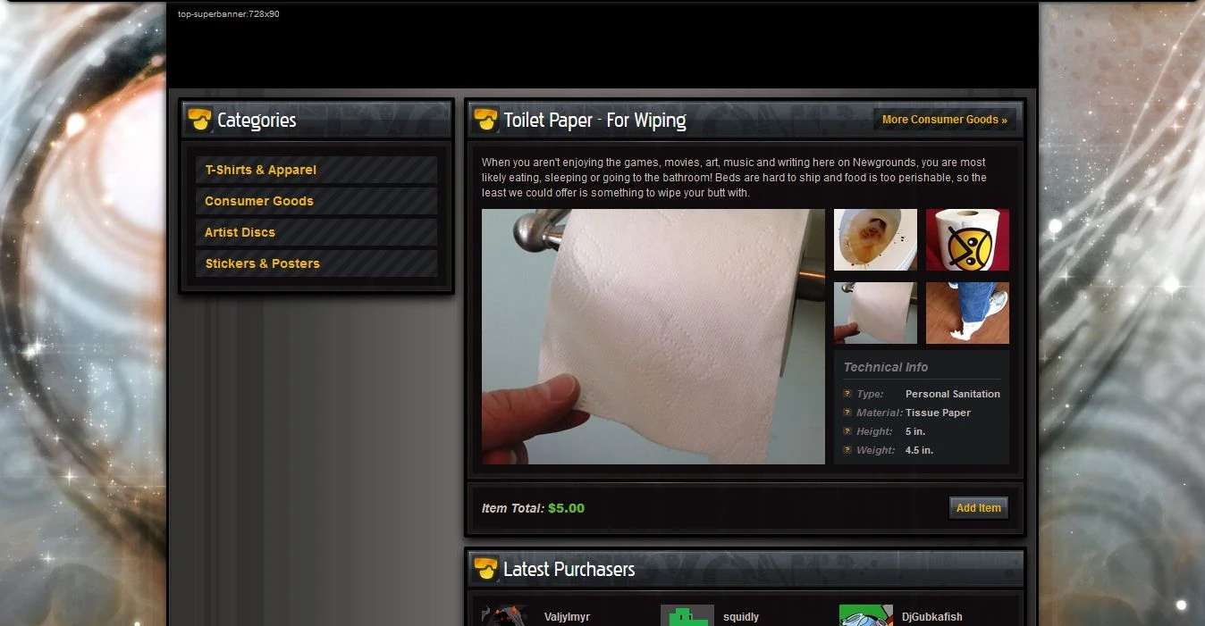 Tom posted a thread announcing the relaunch of the Newgrounds store with a shift to more practical consumer products with broad appeal. Tom had met with an ecommerce consulting agency prior to the original store closing and they had recommend this pivot away from shirts with cartoons on them to consumer products that everyone needs. The first new product would be Newgrounds branded toilet paper, available to purchase for $5 per roll.