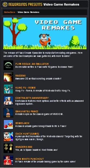 These are pages grouping together Flash submissions of a certain subject. Collections can be accessed on the top navigation bar, along with the Flash Portal, Audio Portal, and BBS. In total, there are about 40 main collection pages, some of them, like the Video Game Parodies page, lead to many more specific collections. A number of crews have collection pages, which groups often consider as a key point in their recognition by Newgrounds.